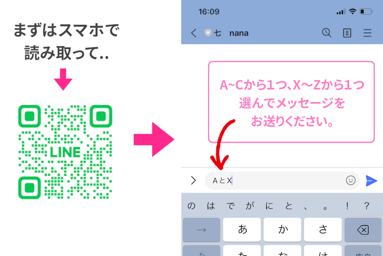 こちらのQRコードをスマホで読み込み、LINE画面下のメッセージ枠に選んだ2つ(例:AとX)をご入力ください。