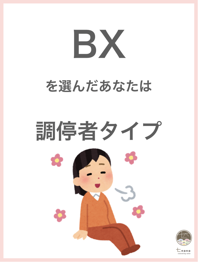 このタイプの方は平和と調和が好きな、ゆったりマイペースな人です。協調性が高く、周囲と仲良くやっていきたいことに心をくだいています。
