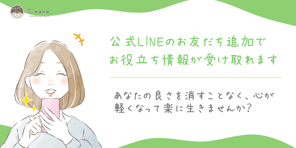 七*nanaのLINEにお友だち追加をしていただくと、当サロンでしか得られない「心が軽くなるためのお役立ち情報」が受け取れます😊